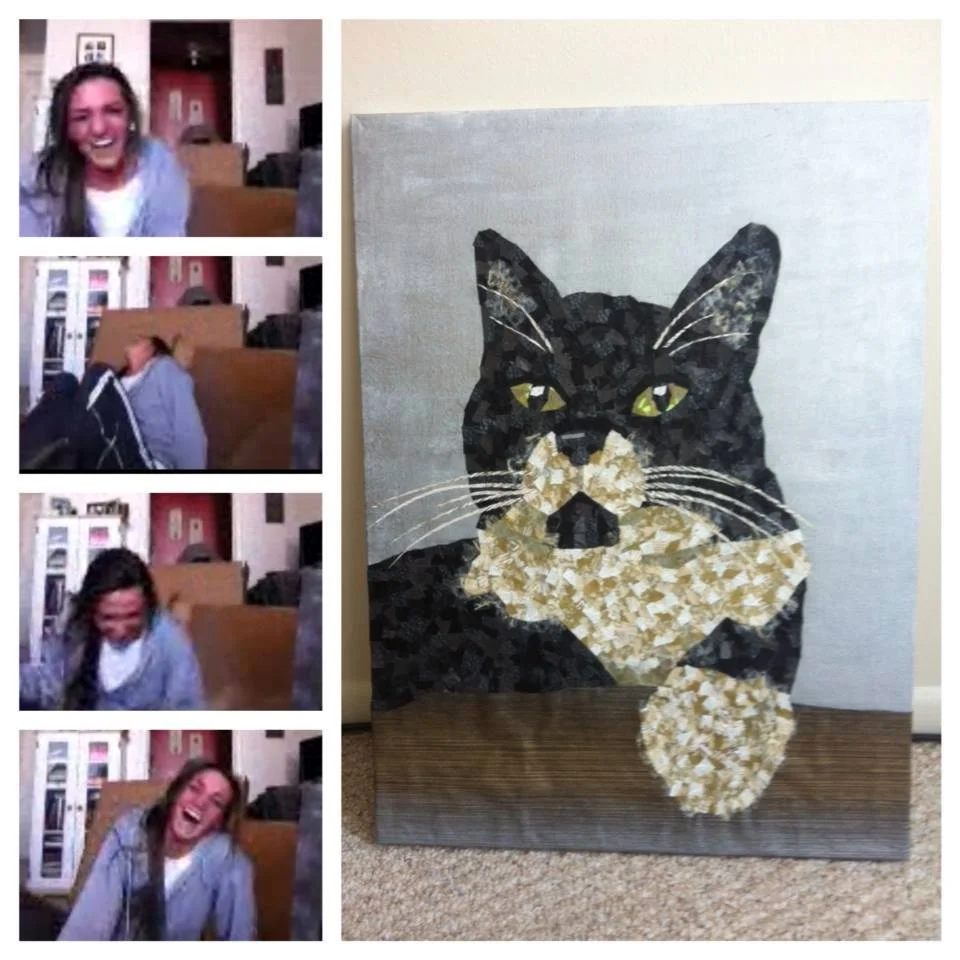 This project inspired two of my favorite pictures: opening the gift (which was screenshot via Skype) and a very embarrassed cat sitting next to his portrait.